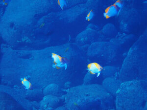 We saw large, tumbled boulders with Pyramid Butterflyfish primarily along the coastline and surging waters pushing into the cliff-lined shore. It was very different scenery compared to coral heads and the sand bottom of Hapuna Bay. It indicated heavy coastal surf that caused the massive boulders to become smooth like river pebbles or a lava beach near the south end of our island. These boulders were 4-5′ around, and you could hear the smaller ones tumbling against themselves like a big rock polishing machine.