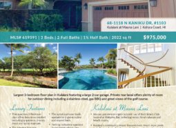 I just listed unit 1103 in Kulalani at Mauna Lani. This golf course front, 3 bedroom 2.5 bathroom townhome is the largest model in Kulalani This award winning plan features 2,022 sq feet of fabulous open yet private luxury living. The moment you enter the beautiful foyer and experience the sweeping spiral staircase you know… Read More »